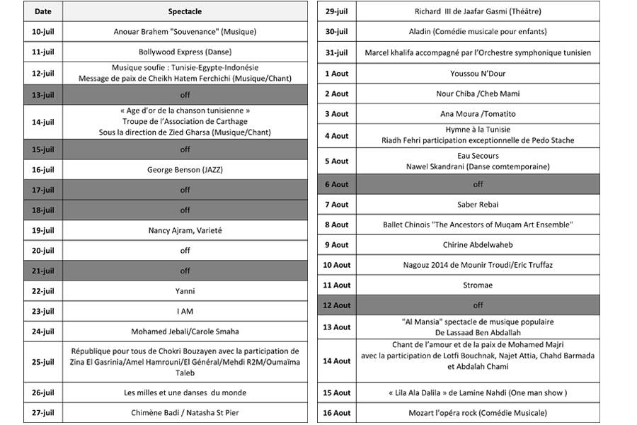 La cinquantenaire du festival le plus attendu de la Tunisie se tient du 10 juillet jusqu’au 16 août 2014 avec la participation des plus grandes stars tunisiennes et internationales, dont Yanni et Stromae.
