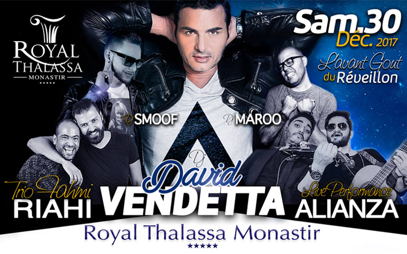Le Royal Thalassa Monastir accueillera le 30 décembre 2017 les meilleurs artistes sur la scène musicale pour l’avant-goût du Réveillon. Une soirée légendaire vous attend avec la participation des deux fameux DJ internationaux tel que DAVID VENDETTA, oui vous ne rêvez pas ! Il sera bien en Tunisie le Samedi 30 décembre 2017 et il l'annonce même sur les réseaux sociaux !