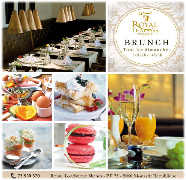 Si vous vous demandez quel sera le meilleur endroit pour pouvoir vous détendre Marhba.tn a la réponse : le brunch du Royal Thalassa Monastir, là ou tout devient une surprise chaque dimanche. A partir de 10h30 et jusqu'à 14h30 le déjà fameux Chef Hakim vous donne rendez vous au restaurant Mona. Au Royal Thalassa aucun brunch ne ressemble à un autre et qu’est ce que ça peut être de plus gourmand que de combiner un petit déjeuner tardif avec un déjeuner festif ?! Peut être que vous devez déjà communiquer aux amis que le dimanche ils vous trouvent au Royal Thalassa Monastir parce que c’est plus que sur que vous allez devenir « brunch addicted » après avoir gouté les plaisir salés, sucrés inoubliables.