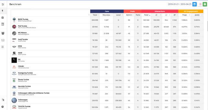 Facebook reste le réseau social préféré des marques d’automobiles en Tunisie et le classement varie très souvent! Pour jeter un coup d'œil sur le rapport détaillé de toutes les marques Auto en Tunisie il vous suffit de tester la version démo de http://kpeiz.digital/ l'outil référence d'analyse et de Benchmarking sur Facebook.