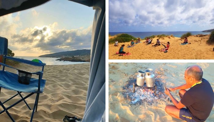 Nous avons décidé de camper dans une plage sauvage à Cap Serrat, loin de toute civilisation, en compagnie de Neila Drira et Silvia Ares, fondatrices de « The Yoga Studio » et du « Capitaine Pim » qui nous a assisté durant notre weekend d’évasion.