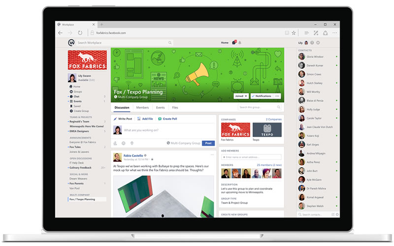 Le concept est simple; une plateforme Facebook privée avec news feed, like, réactions, recherche, trending posts où vous pouvez parler avec des collègues du monde entier en temps réel, faire une réunion brainstorming dans un group ou suivre des présentations sur Facebook Live.