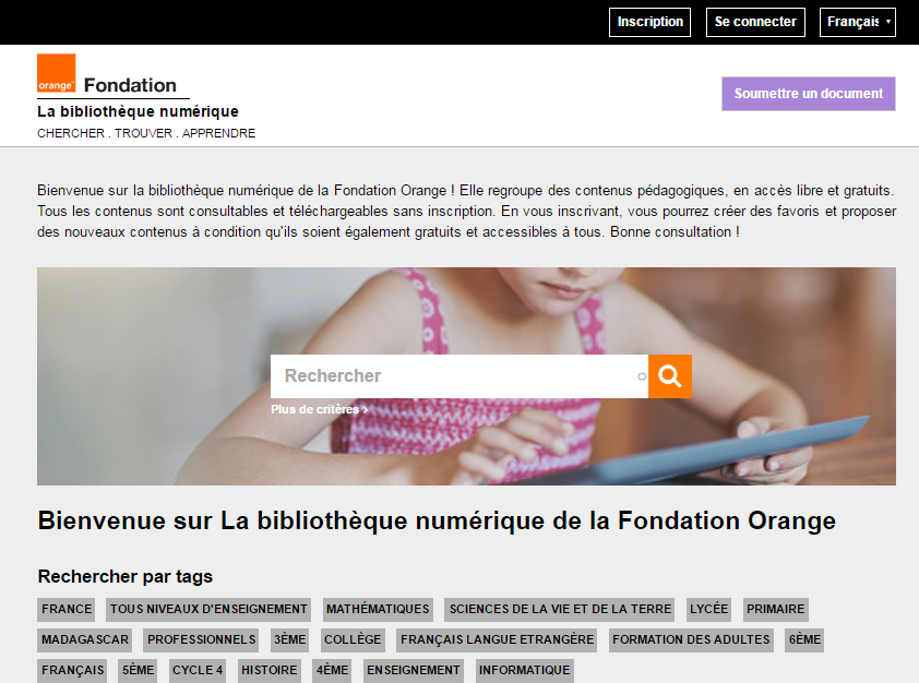 La Bibliothèque Numérique Orange contient en accès libre et gratuit, un contenu riche de quelques milliers d'oeuvres à vocation pédagogique, qui couvrent une large palette de matières pour touts les niveaux: scolaire, universitaire ou bien formation professionnelle. Vous trouvez tout le contenu disponible en ligne: http://bibliotheque.fondationorange.com/