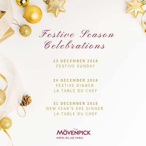 Le Mövenpick Hotel du Lac Tunis vous invite à vivre pleinement cette période magique de l’année avec le Festive Dinner le 24 décembre 2018 et le New Year’s Eve Dinner le 31 décembre 2018.