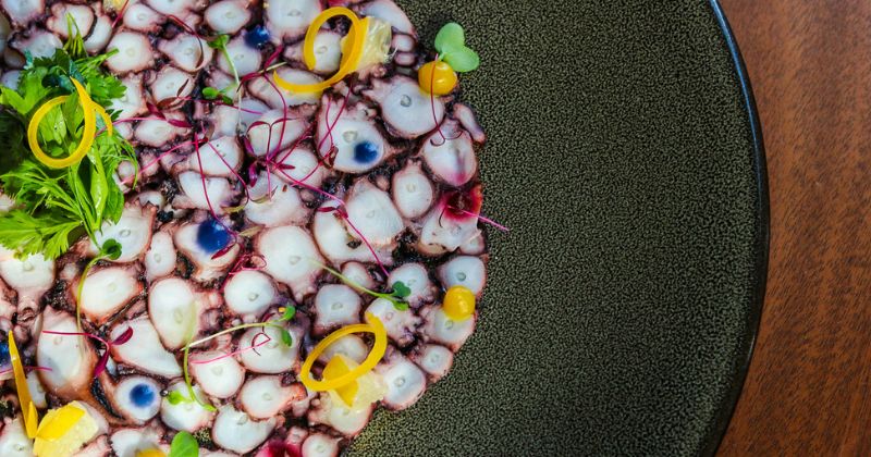Laissez-vous tenter par le fameux Carpaccio de Bar tiède à la salamandre, avec une touche colorée de coriandre et de citron vert agrémenté d’huile d’olive.