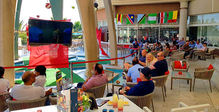 Plusieurs TV ont été placés sur la terrasse du Sheraton Hotel. Des baffles ont été également installés au milieu de la terrasse afin de vous assurer une ambiance qui vous emporte rapidement au cœur du stade !