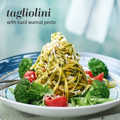 - Tagliolini : Un plat classique, offrant une alternative inhabituelle : le goût distinctif de ce pesto est dû aux noix, légèrement plus sucrées et amères que les pignons de pin qu’elles remplacent.