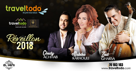 Traveltodo Village Africa JadeThalasso 4* vous invite à passer une soirée du Nouvel An 2018 de rêve en compagnie de vos artistes préférés : la star incontournable de la chanson Tunisienne Zied Gharsa, la Super Star Nabiha Karaouli et la vedette Chedy Achhab. Avec la participation de la troupe orientale du Maestro Haithem El Heni.