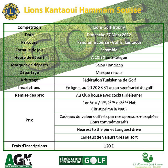 Le Lions Club El Kantaoui Hammam Sousse vous donne rendez-vous le 27 mars pour sa 20ème Édition de la compétition au Parcours de Golf d’El Kantaoui.