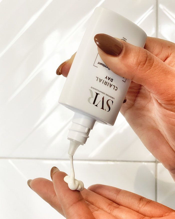J’ai toujours eu ces imperfections et ces taches sur le visage que j’essayais de cacher avec du fond de teint couvrant. À un certain moment, j'ai décidé de tester un soin qui uniformise et hydrate ma peau. J’ai donc opté pour le Clairial Day de la marque SVR, un correcteur uniformisant anti-taches.