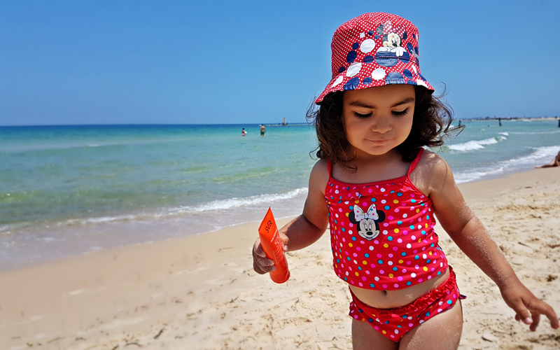 Mais avant de courir en direction de la plage, on doit être surs de ne rien oublier : les serviettes, les jouets de notre petite Iris, de l’eau, et surtout la protection solaire. Le soleil étant assez fort, il est donc très important de se protéger afin d’éviter les coups de soleil..