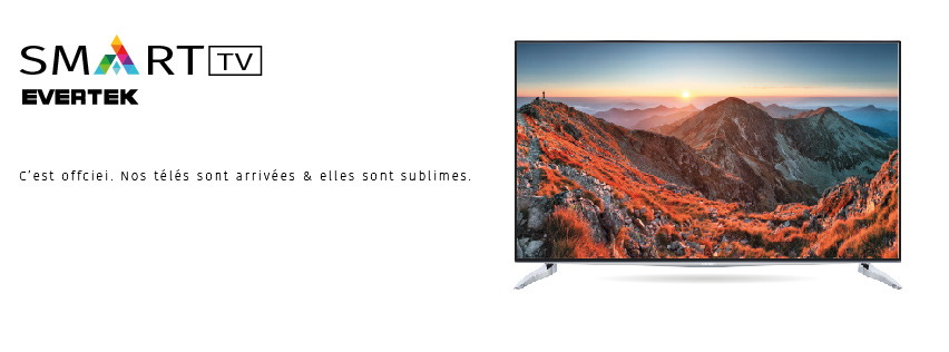 Evertek présente ses Smart TV, deux modèles de téléviseurs de 55 pouces, plat et un autre incurvé. Des téléviseurs 4K UHD munis d'écrans LED et de 3D(vendus avec 4 lunettes 3D), mais qui permettent aussi de naviguer sur le net grâce a leurs système web OS.