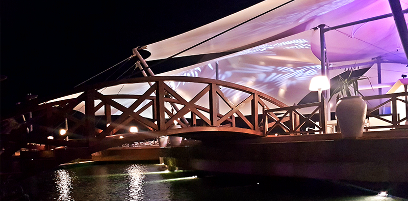 Du côté de la piscine, le restaurant est entouré d’un grand bassin. Pour y accéder, on a dû passer par un petit pont à peine éclairé que je trouve d’ailleurs assez romantique.