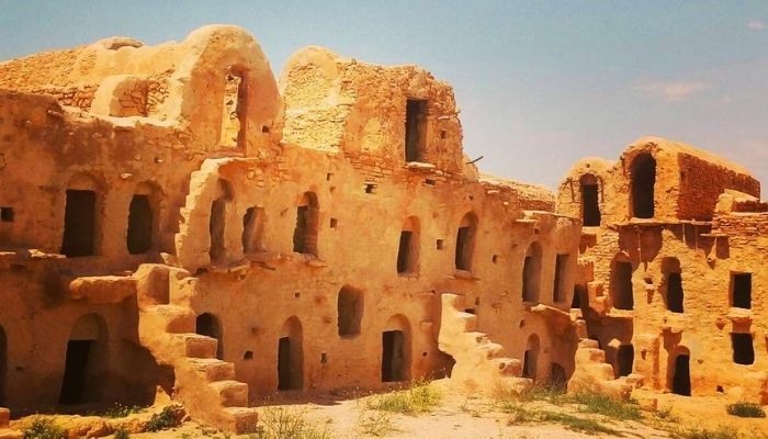 A l’origine le mot ksar (ksour au pluriel) désignait un grenier fortifié, avec des ghorfas (chambres) placées autour d’une court intérieure avec l’entrée bien cachée. Plus tard les ghorfas viennent d’être utilisées comme logement pour les tribus locales. L’âge exacte de ces constructions ne peut pas être fixée vu l’inexistence des matériaux utilisés jadis au bâtiment mais la théorie générale accepte le fait qu’ils ont plus de 2.000 ans. Les ksour étaient habités par les Garamantes, population berbère sédentaire et très avancée pour le Vème siècle av.J.Ch quand Hérodote parle d’eux.